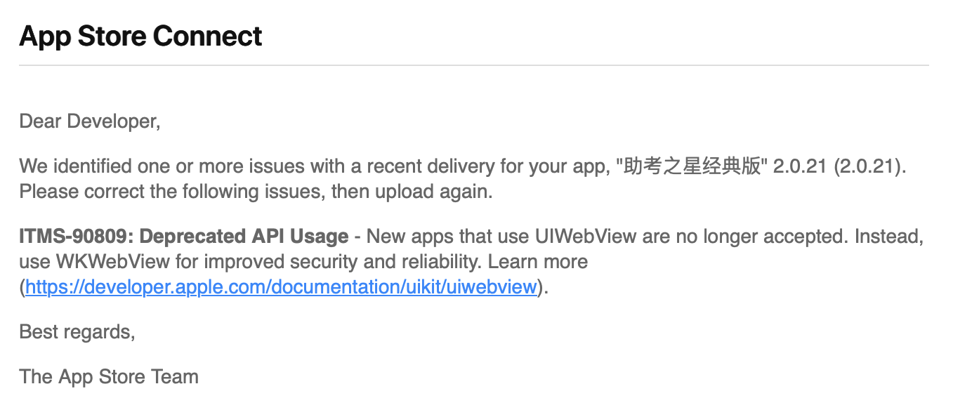 2020年4月30日,苹果废弃了 UIWebView,而采用WKWebView,如还包含UIWebView,在upload iTunes connect 时就会收到类型的邮件.